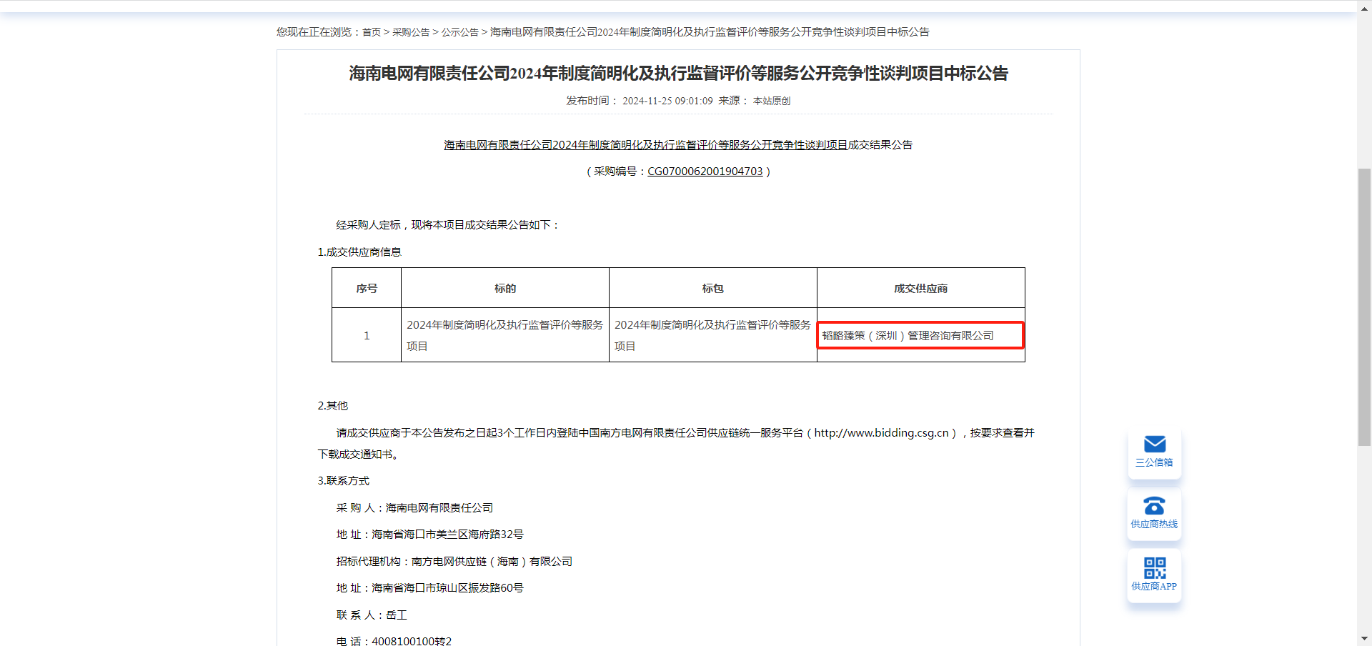 2024年11月25日,韬略臻策收到了海南电网有限责任公司2024年制度简明化及执行监督评价等服务公开竞争性谈判项目中标公告(如下图所示),并开展有关《2024年制度简明化及执行监督评价等服务项目》的后续工作。